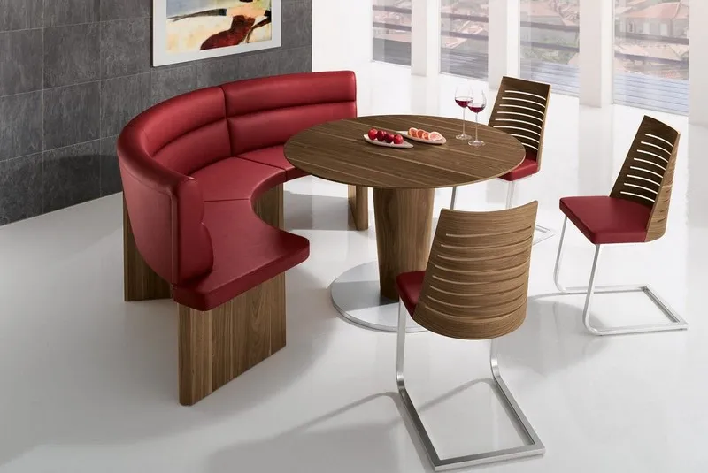 - Полукруглый. Такой модели нужно место, поэтому она подходит для больших кухонь. Обычно ее приобретают в дополнение к большому круглому столу посреди помещения.