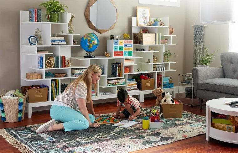 Уменьшить радиус обитания игрушек на полу детской комнаты помогут различные конфигурации мебельных гарнитуров и емкости наподобие корзин, коробов и сундуков. Основным недостатком последних является невозможность найти именно «этого розового зайца» среди кучи мячей, кубиков, машинок. Систематизировать этот хаос с целью порядка и прививания ребенку навыков классификации можно, используя специальные стеллажи.