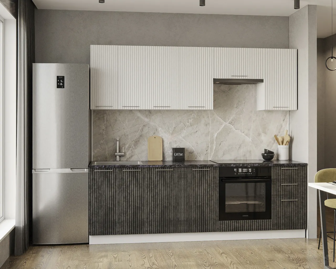Каркас и фасад кухонного гарнитура “Абрис” выполнены из прочных и экологически безопасных материалов материалов. Покрытие устойчиво к перепадам температуры и высокой влажности. Столешница устойчива к механическим повреждениям. На ней можно спокойно резать овощи или фрукты, а также готовить.