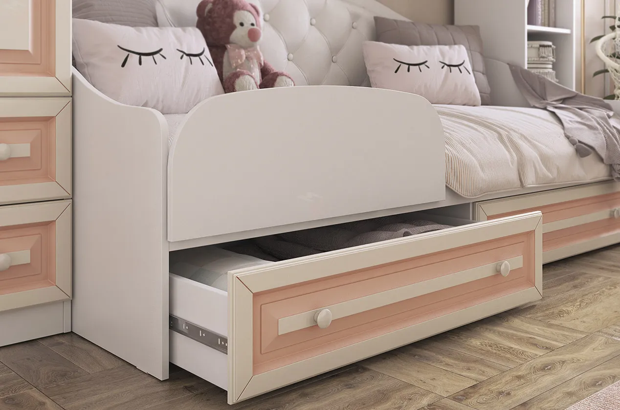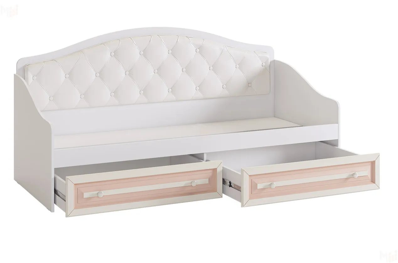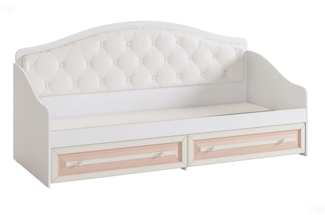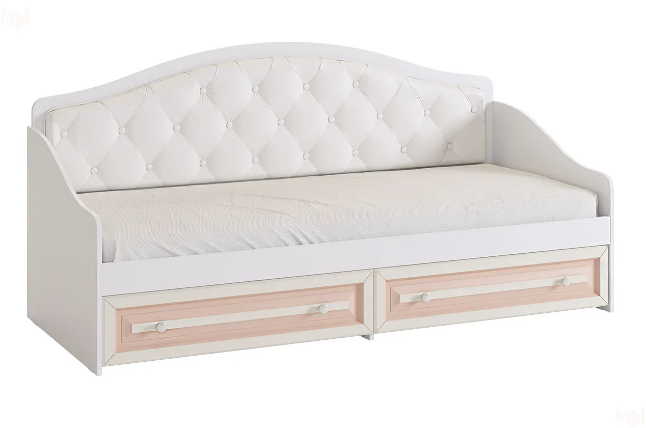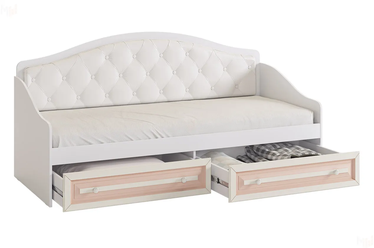 Софа из серии «Алиса». Выполнена с белым корпусом и кремовыми крашеными фасадами из МДФ с нежно-розовой патиной. Спинка софы – мягкая, со стяжкой. Это замечательный вариант для спальни и гостиной: В софе сочетается спальное место и уютный диванчик для гостей. В выдвижных ящиках можно хранить постельное белье. «Алиса» - личный уголок Франции!