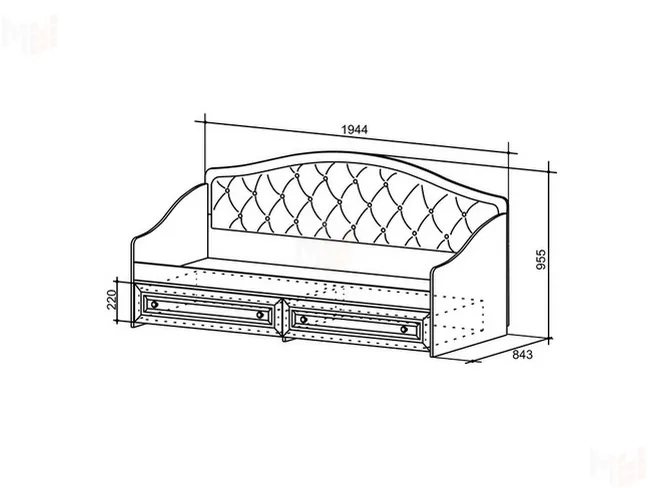 Состоит из: каркаса из ЛДСП, 2-выдвижных ящиков и мягкой спинки с каретной стяжкой.