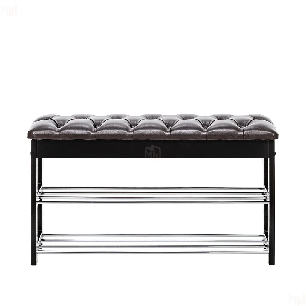 Широкая двухместная банкетка с мягким сиденьем и полкой для обуви. Она сделана в незамысловатом дизайне и органично впишется в любой интерьер.