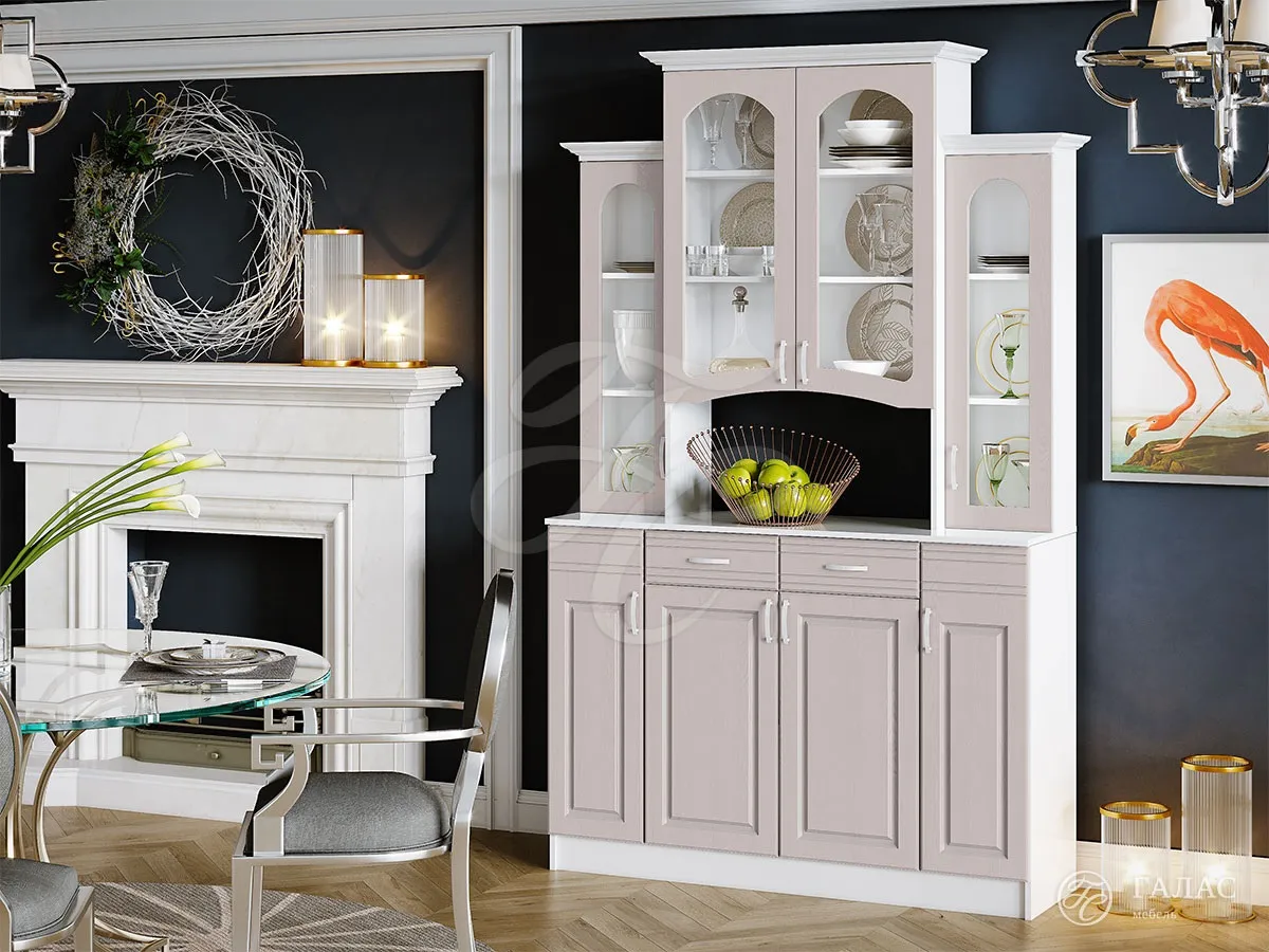 Буфет Констанция имеет классическое оформление, благодаря чему прекрасно впишется в любое интерьерное решение. Он состоит из нескольких вместительных отделений, позволяющих компактно разместить тарелки, сахарницы, чайники и многие другие предметы, которые могут пригодиться на кухне. Для дополнительного удобства в буфете предусмотрена широкая столешница, она может играть роль подставки для сервиза или использоваться в качестве рабочей поверхности. Буфет оформлен декоративным карнизом.