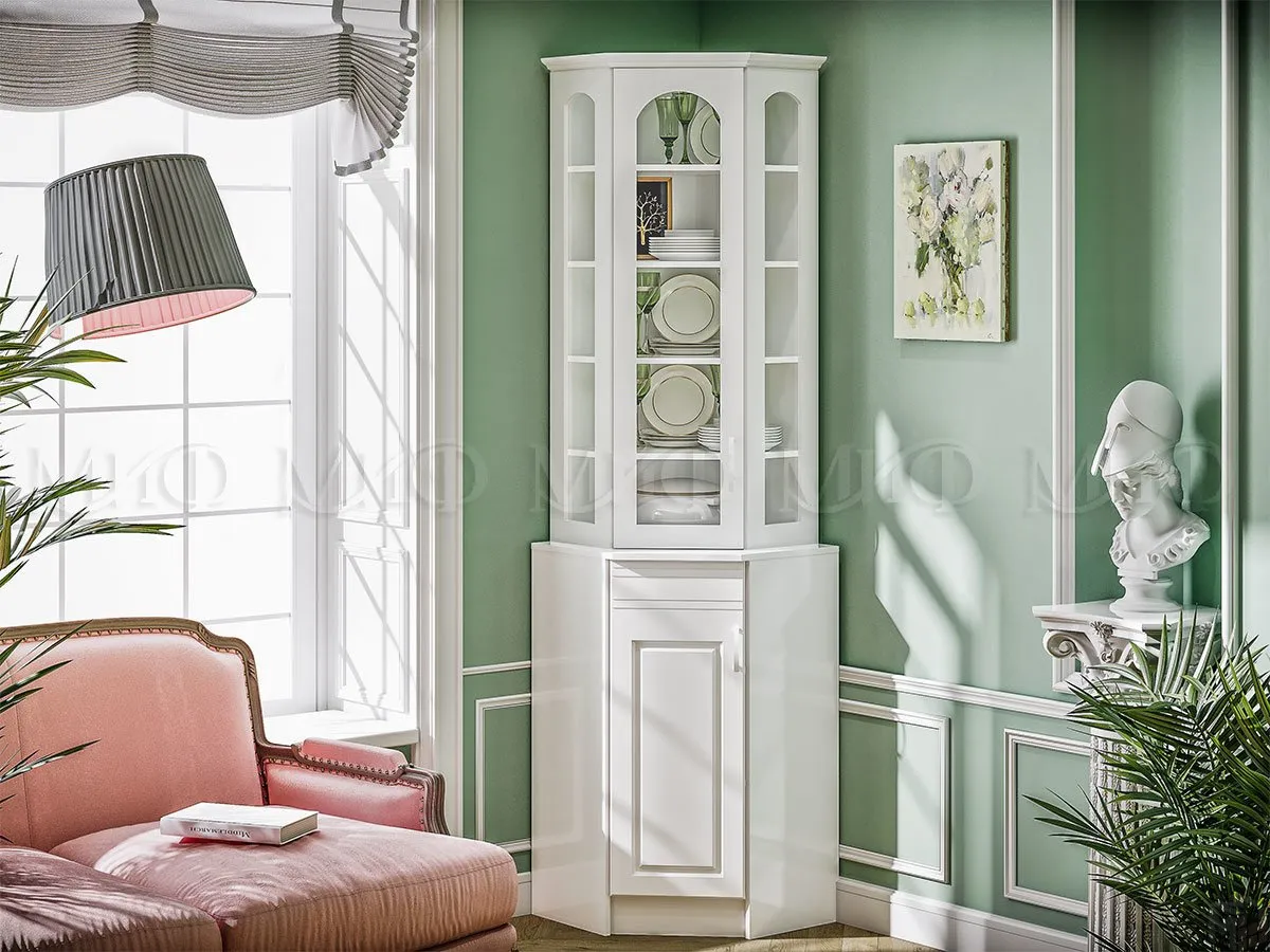 Буфет "Констанция" идеально впишется в кухонный интерьер, выполненный в классическом или дворцовом стиле. Угловая модель имеет изысканный дизайн и стильное цветовое оформление. Ее легкость и изящество подчеркивают элегантные фасады, изготовленные из прозрачного стекла. Буфет оснащен множеством удобных полочек. Здесь найдется место для тарелок, чашек, кофейников, молочников, заварочных чайников и другой посуды. Буфет оформлен декоративным карнизом.