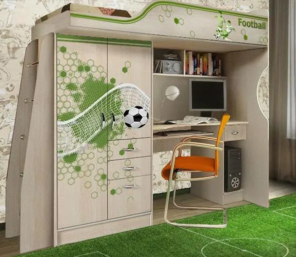 Производится мебель в цвете дуб кремона с использованием декора в виде фотопечати, 3D-рисунок нанесен прямым способом сразу на ЛДСП. Тематика серии - футбол. Спальное место 1900х800 мм.