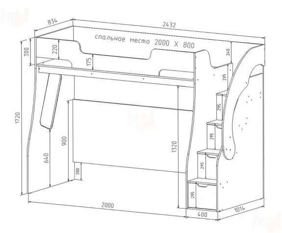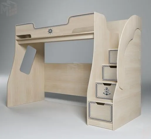 Кровать-чердак Капитан КП-23/1 для детей и подростков. Используется в качестве самостоятельного модуля для сна (безопасное верхнее спальное место 2000х800 мм и встроенная лестница-комод с ящиками) или вместе с другой мебелью серии, которую легко разместить в пустую нишу (длина 2000 мм) чердака. Бортик и ящики декорируются прямой уф-фотопечатью.