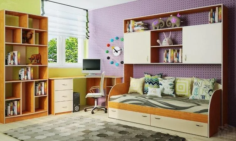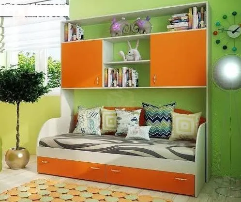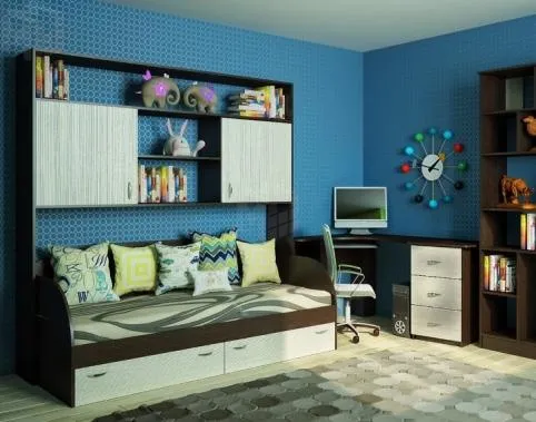 Кровать 13/7 СВ Фанки Кидз с полноценным спальным местом 1900х800 мм. Матрас в стоимость не входит. Толщина матраса должна быть не менее 8 см. Основанием ложе является лист ДВП. Внизу есть два ящика для белья. Выдвигаются на роликовых направляющих. Внешне кровать сделана в виде дивана со спинкой из ЛДСП.