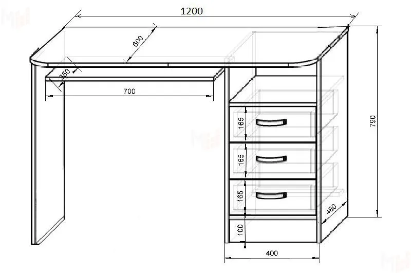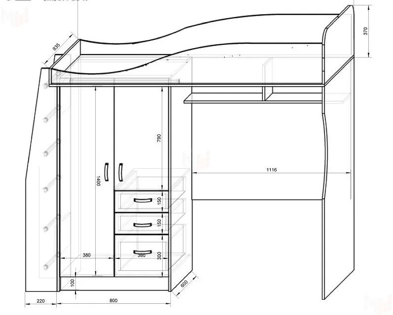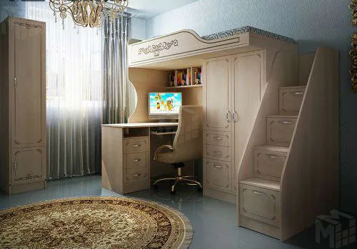- удобная кровать-чердак со встроенным шкафом для хранения вещей, письменным столом с выдвижными ящиками для школьных принадлежностей;