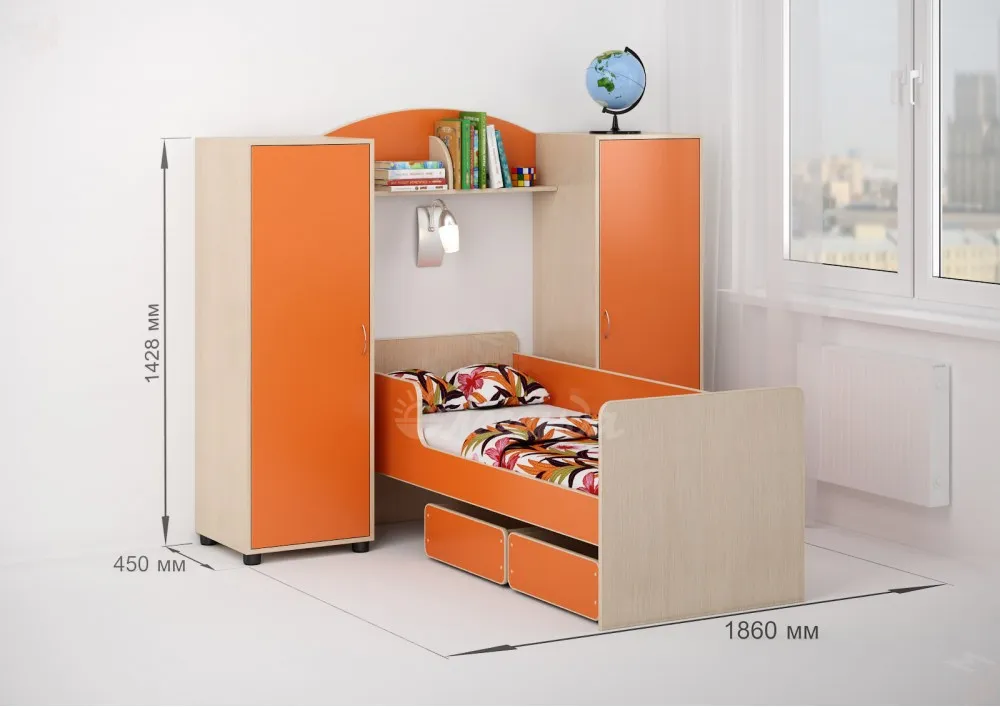 Между пеналами располагается центральная часть комплекта - детская кровать Легенда 40.Кровать идеально вписывается в пространство под полкой,Вам остается лишь решить,на какую сторону установить борт,а на какую ребенок будет слезать к кровати. Это удивительная кровать - трансформер,которая имеет четыре варианта сборки! В комплект входят два удобных ящика на колёсиках.Ящики легко закатываются и выкатываются,с этим без труда справится ребенок. Отличные помощники в решение вопроса хранения игрушек и других вещей.Ящики идеально помещаются под фигурный бортик.