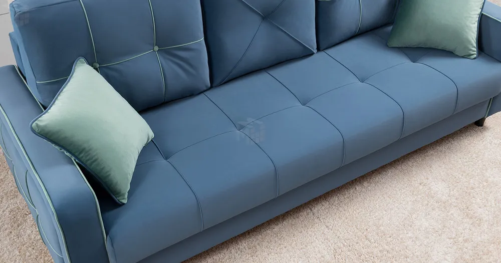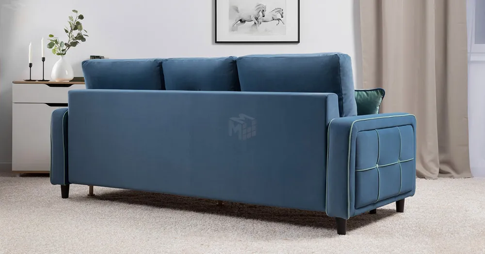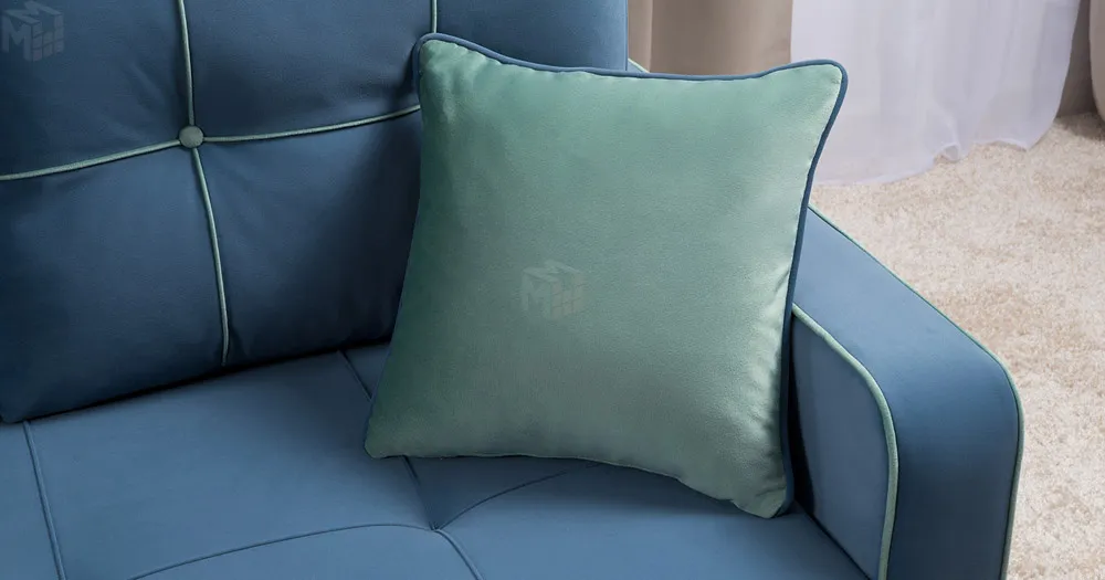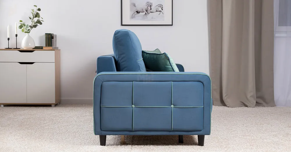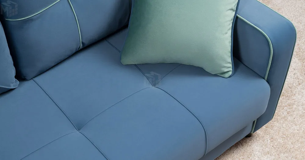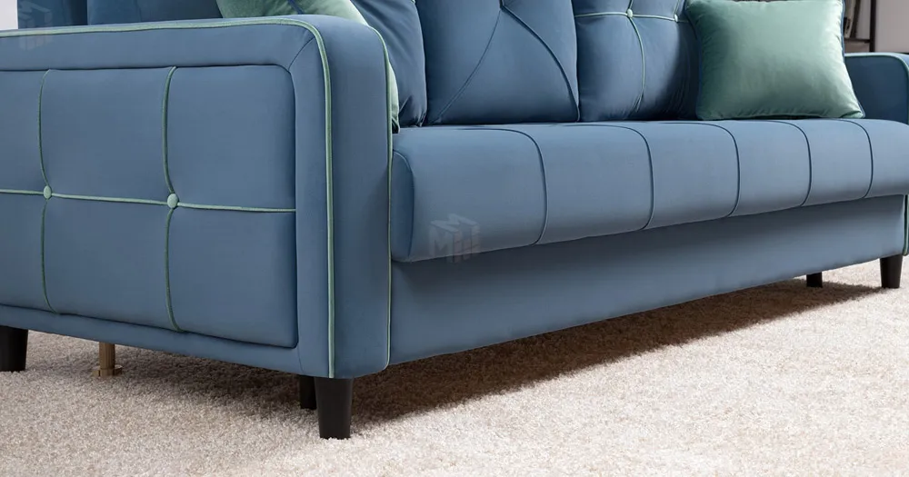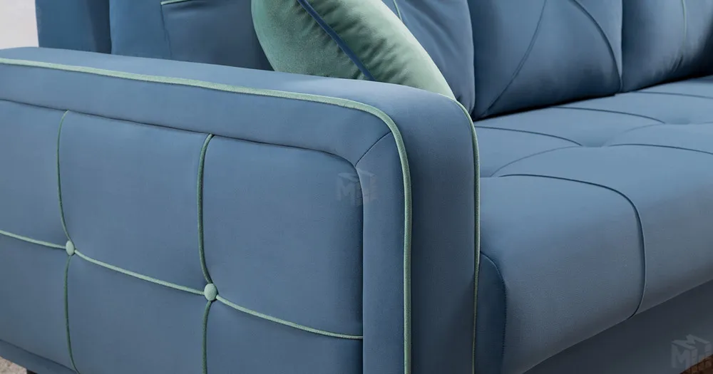 Декоративные канты на подушках и вставке подлокотников. Пуговицы в местах пересечения кантов на подушке и вставке подлокотников. По торцам подлокотников и думках контрастный декоративный кант. Защипы на сиденье и средней большой подушке.
