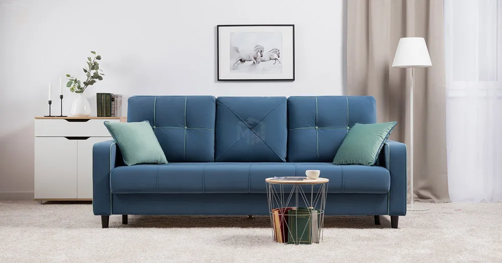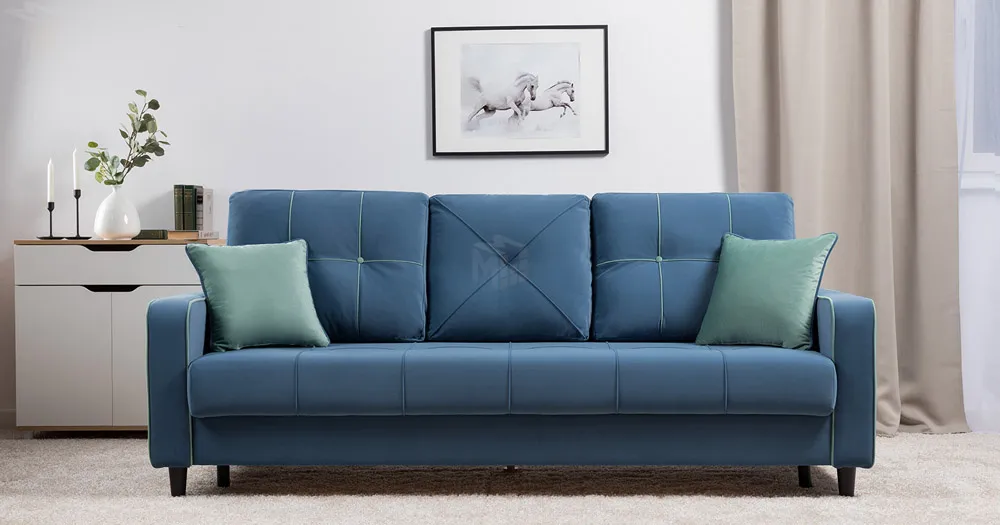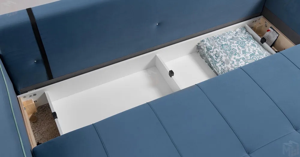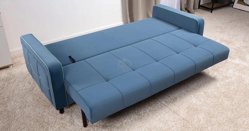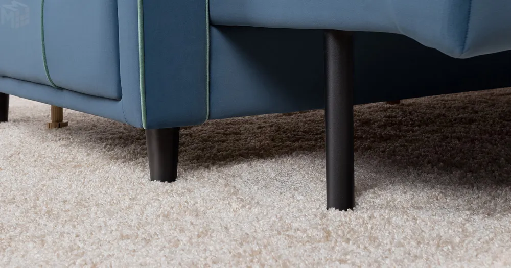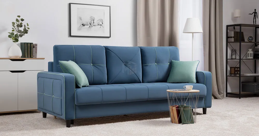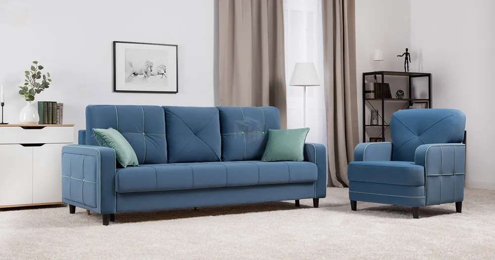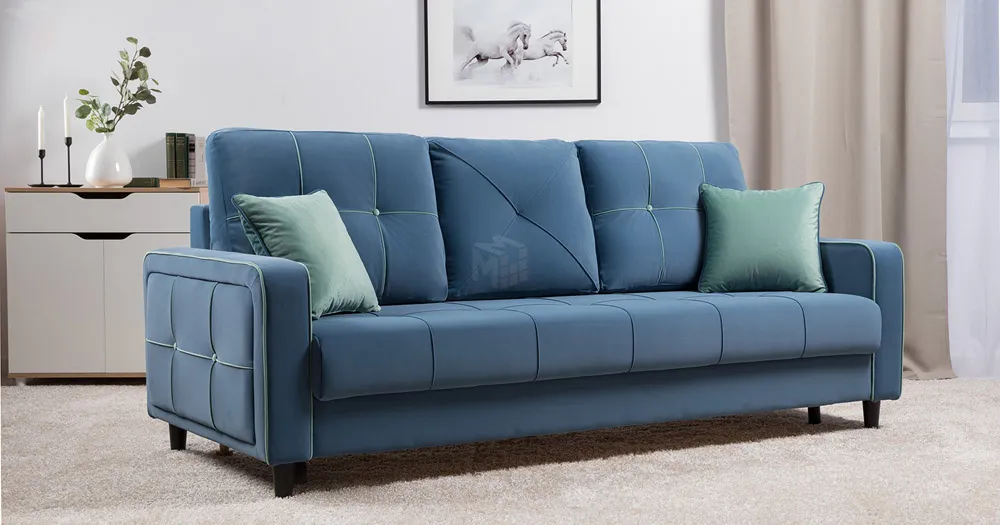 Декоративные канты на подушках и вставке подлокотников. Пуговицы в местах пересечения кантов на подушке и вставке подлокотников. По торцам подлокотников и думках контрастный декоративный кант. Защипы на сиденье и средней большой подушке.