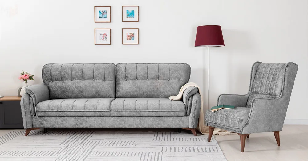 Декоративные канты на подушках дивана, подлокотниках и сиденье. Стежка на передней части сиденья и внешней части подлокотника. Защипы на верхней части подушки. Втяжки с пуговицами на приспинных подушках.