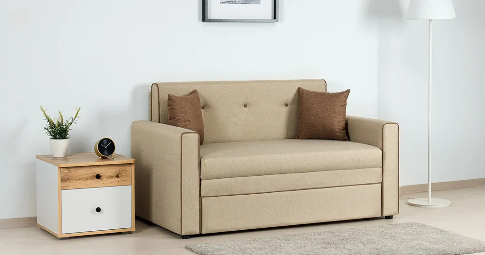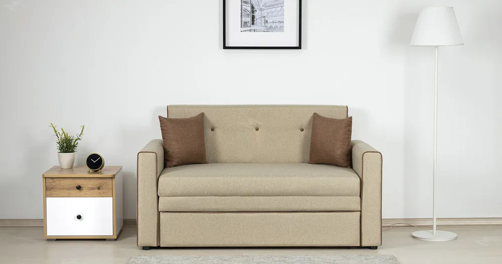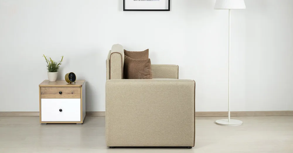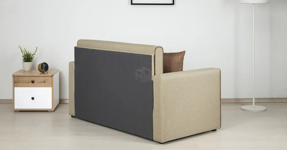 Декоративный контрастный кант по торцу спинки, торцу подлокотника, по верхнему срезу царги. Утяжки с пуговицами на спинке дивана. Две декоративные подушки в контрастной ткани.