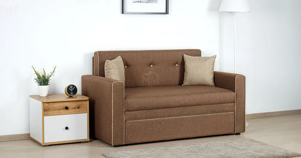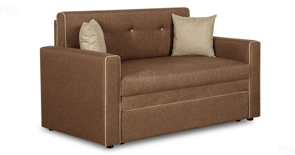 Декоративный контрастный кант по торцу спинки, торцу подлокотника, по верхнему срезу царги. Утяжки с пуговицами на спинке дивана. Две декоративные подушки в контрастной ткани.