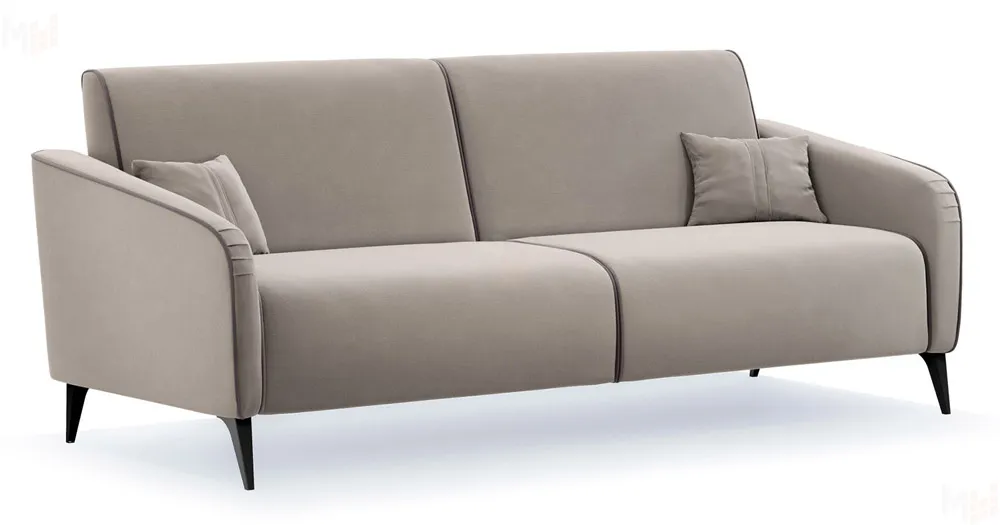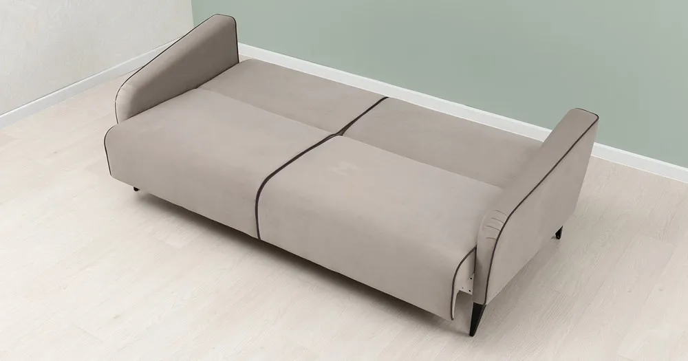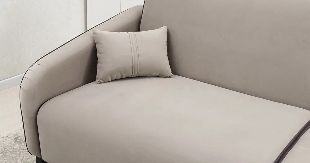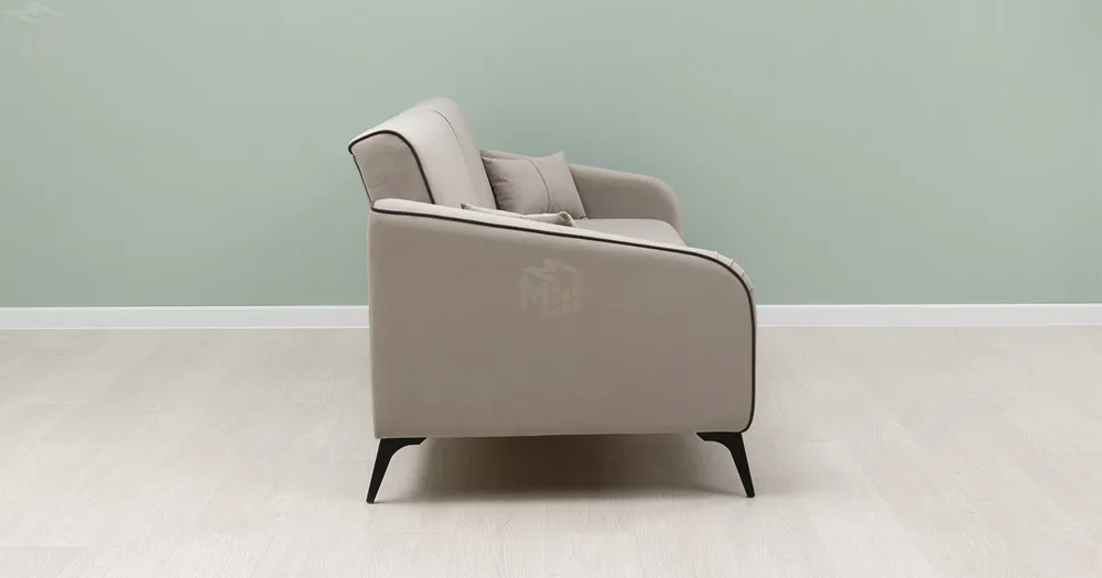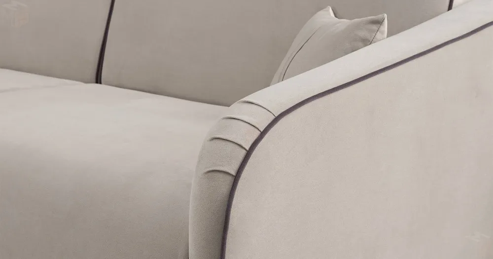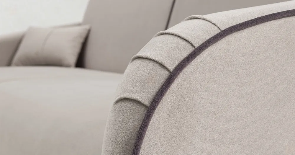 Спинка и сиденье разделяются пополам двойным кантом по центру и одинарным по краям сидения, для придания одной единой формы. Подлокотники с изгибом на лицевой стороне и мягкими закругленным углом со складками, с выраженным контрастным ровным кантом по внешнему контуру изделия и изогнутой линией канта.