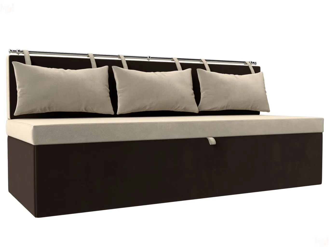Прямой диван Метро станет необычным дополнением Вашей кухни. Сдержанный дизайн выглядит эстетично и аккуратно. Спинка дополняется съемными подушками, закрепленными на металлической трубе. Конструкция функциональна, легко трансформируется в односпальную кровать.