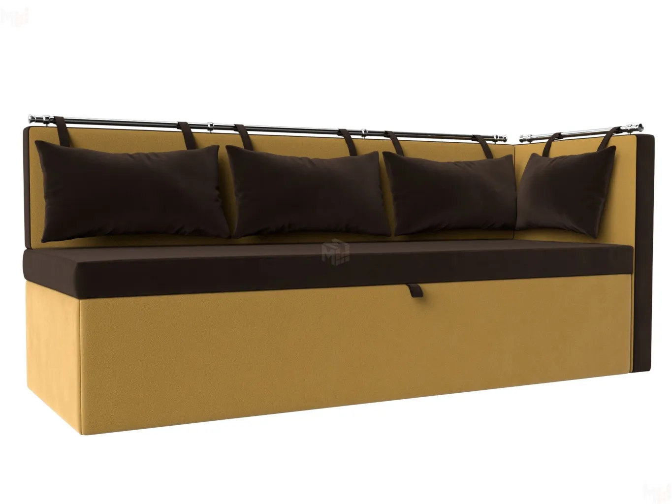 Метро – элегантный угловой диван с компактными параметрами. Для его размещения не потребуется много места. По дизайну схож со скамьей, дополненной небольшим углом. Обратите внимание на спинку, она украшена мягкими подушками с петельками, закрепленными на металлической трубе. Модель устойчива благодаря прочным пластиковым ножкам. -