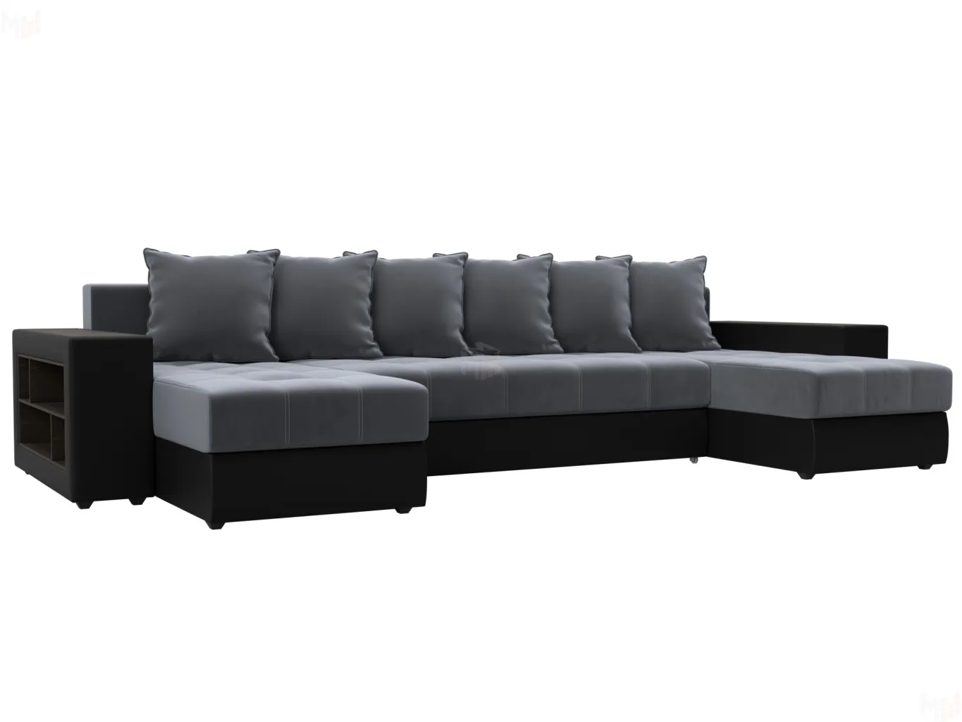 Большой п-образный диван Дубай универсален в использовании. Верх подлокотников – деревянные мини-столики. Сбоку имеются глубокие полочки для хранения предметов декора. Спинка состоит из 6 мягких подушек под цвет обивки.