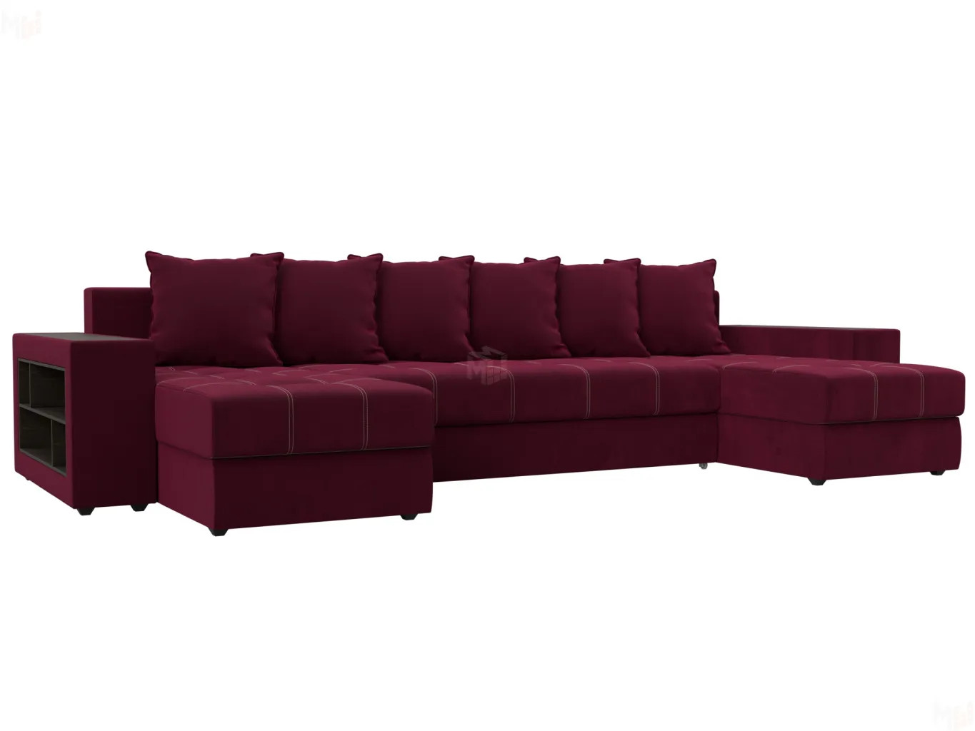 Большой п-образный диван Дубай универсален в использовании. Верх подлокотников – деревянные мини-столики. Сбоку имеются глубокие полочки для хранения предметов декора. Спинка состоит из 6 мягких подушек под цвет обивки.