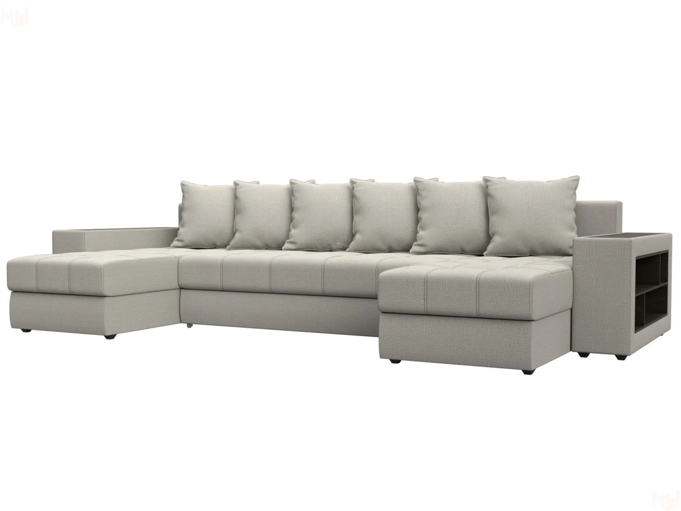 Большой п-образный диван Дубай универсален в использовании. Верх подлокотников – деревянные мини-столики. Сбоку имеются глубокие полочки для хранения предметов декора. Спинка состоит из 6 мягких подушек под цвет обивки. В диване предусмотрены вместительные ящики для белья. -
