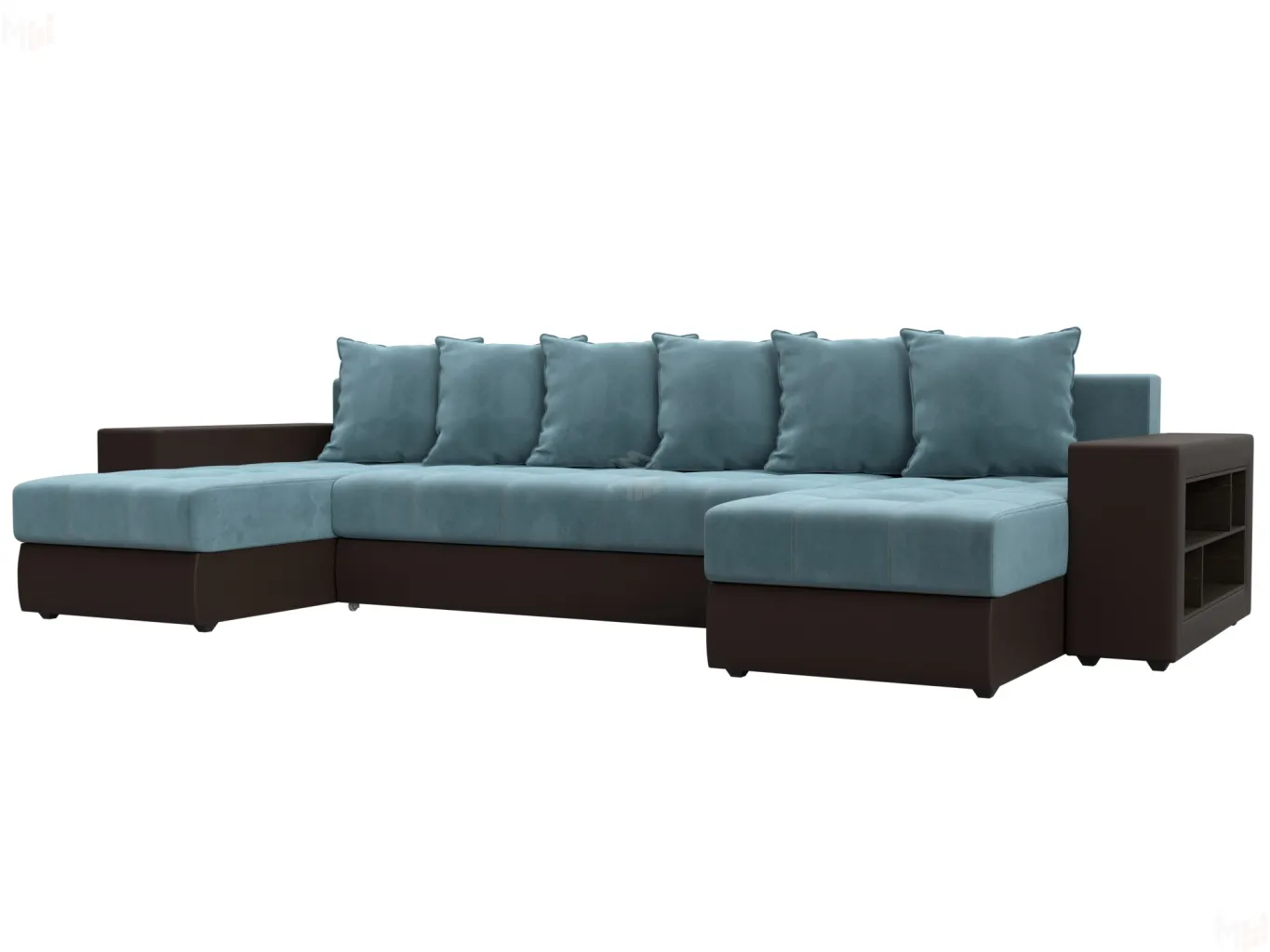 Большой п-образный диван Дубай универсален в использовании. Верх подлокотников – деревянные мини-столики. Сбоку имеются глубокие полочки для хранения предметов декора. Спинка состоит из 6 мягких подушек под цвет обивки. В диване предусмотрены вместительные ящики для белья. -