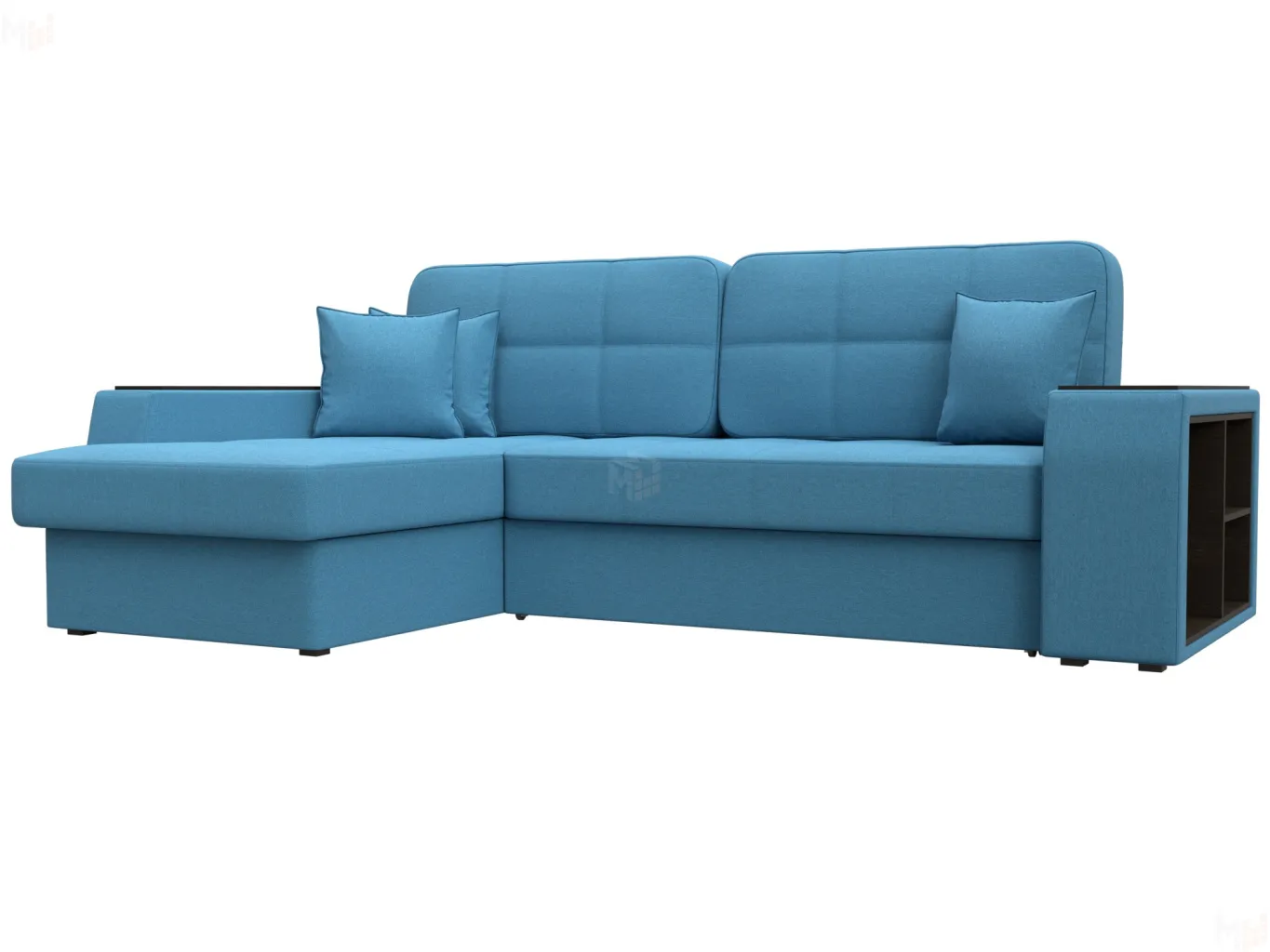 Шикарный угловой диван Брюссель удобен и функционален в использовании. Подлокотники выполняют роль мини-столиков. Одна из боковин дополнена книжными полками, декорированным «под дерево». Под длинной боковиной расположена ниша для белья. Изделие оснащено удобным механизмом трансформации в двуспальную кровать. -