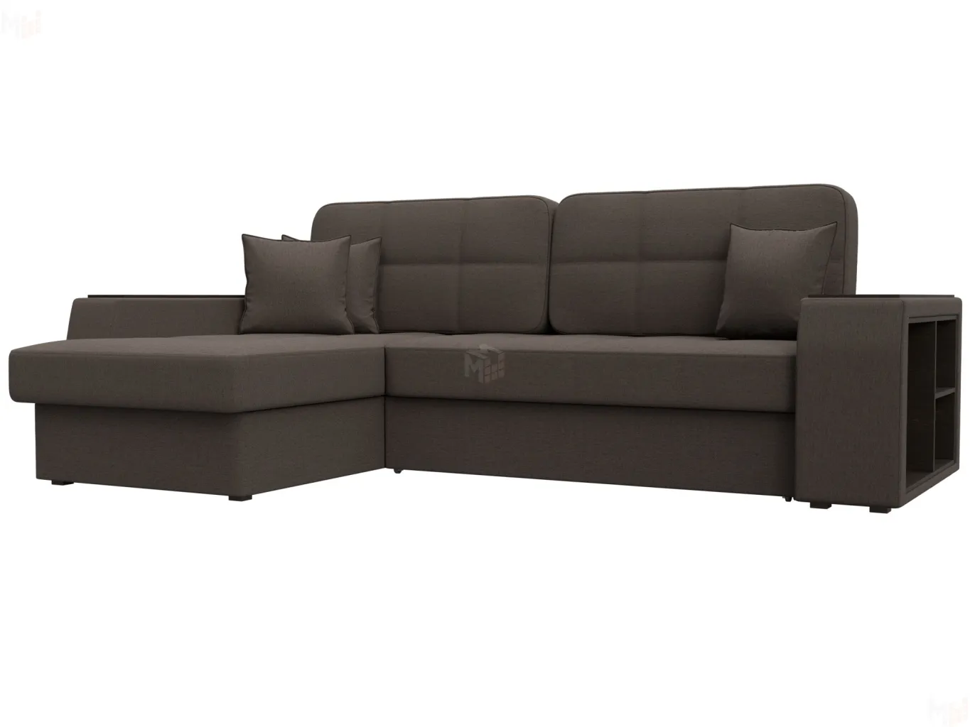 Шикарный угловой диван Брюссель удобен и функционален в использовании. Подлокотники выполняют роль мини-столиков. Одна из боковин дополнена книжными полками, декорированным «под дерево». Под длинной боковиной расположена ниша для белья. Изделие оснащено удобным механизмом трансформации в двуспальную кровать. -