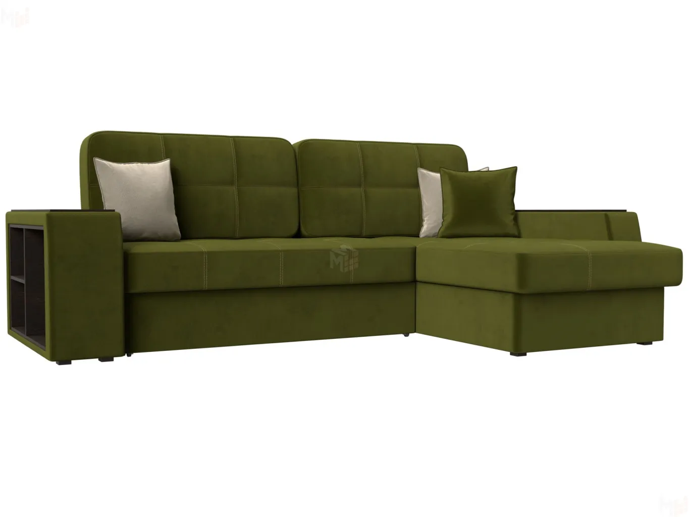 Шикарный угловой диван Брюссель удобен и функционален в использовании. Подлокотники выполняют роль мини-столиков. Одна из боковин дополнена книжными полками, декорированным «под дерево». Под длинной боковиной расположена ниша для белья. Изделие оснащено удобным механизмом трансформации в двуспальную кровать. -