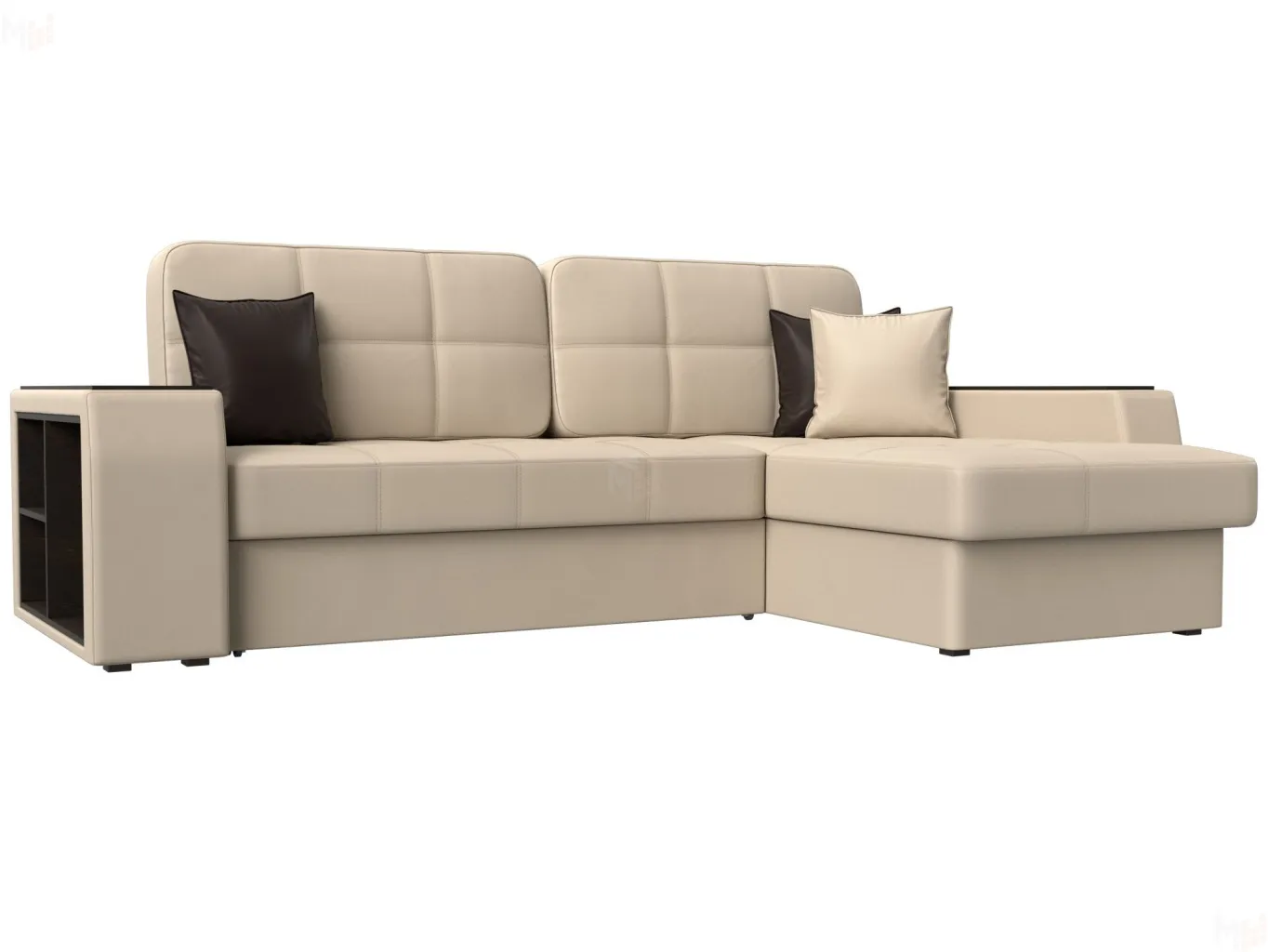 Шикарный угловой диван Брюссель удобен и функционален в использовании. Подлокотники выполняют роль мини-столиков. Одна из боковин дополнена книжными полками, декорированным «под дерево». Изделие оснащено удобным механизмом трансформации в двуспальную кровать.