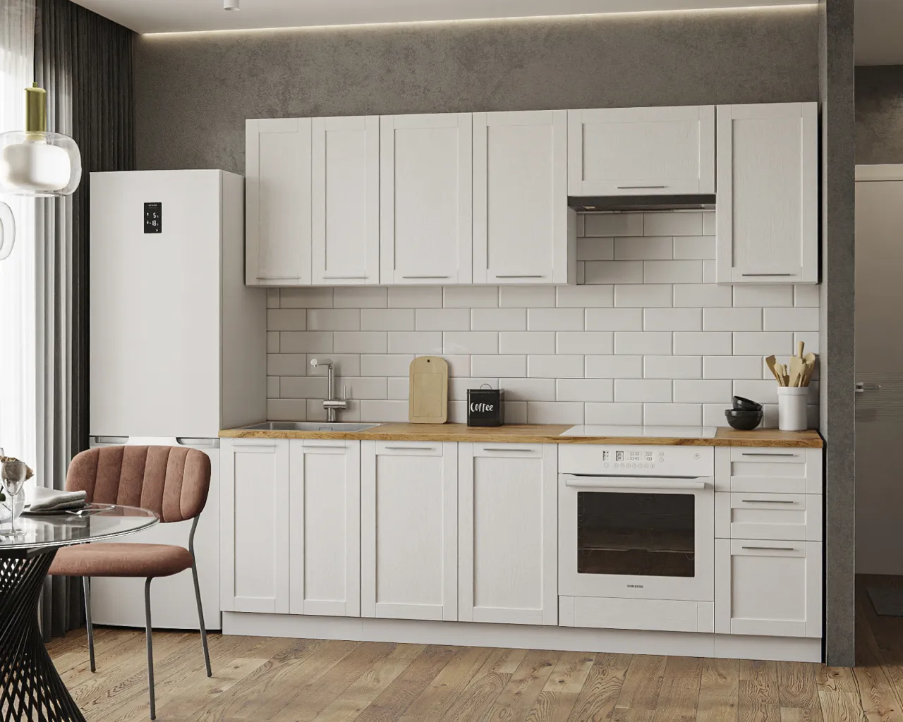 Кухонный гарнитур «Долан» максимально эффективно использует каждый миллиметр пространства. Долан представляет собой современный минималистичный дизайн. Такая кухня смотрится дорого: строгие формы, нет лишних деталей, вся техника гармонично встроена в гарнитур.Верхний модуль кухни «Долан» состоит из 3 шкафа для хранения кухонной утвари и 1 шкаф спроектирован под вытяжку, скрывает ее и не нарушает цельный дизайн кухни.Нижний модуль представлен 4 большими шкафами. Для хранения самой большой посуды и кухонной техники отводится самый просторный шкаф из двух секций. Секция со встроенной варочной панелью и духовым шкафом оснащена выдвижным ящиком для хранения. С правой стороны от этой секции расположен шкаф, который состоит из трёх ящиков на шариковых направляющих. Ящики выдвигаются полностью, открывая доступ ко всем вещам, которые в них находятся. У кухни предусмотрен шкаф со встроенной мойкой. Внутри шкафа есть место для хранения кухонной утвари, инвентаря или мусорного контейнера.