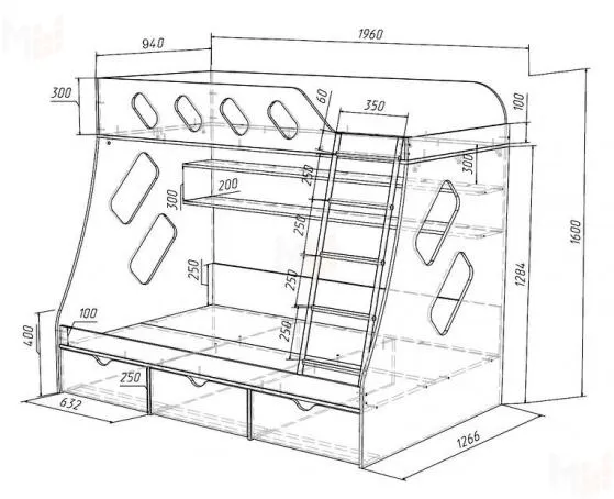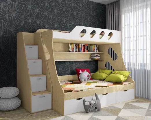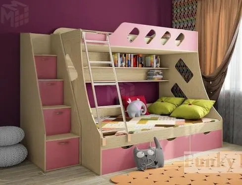 Детская двухэтажная кровать Фанки-16 идеально подойдет для небольших комнат, где несколько детей или где родители вынуждены ютиться в одной комнате с ребенком. На втором этаже кровати размер спального места 1900х900 мм, а внизу полноценная полуторная кровать (размер нижнего спального места 1200х1900 мм).