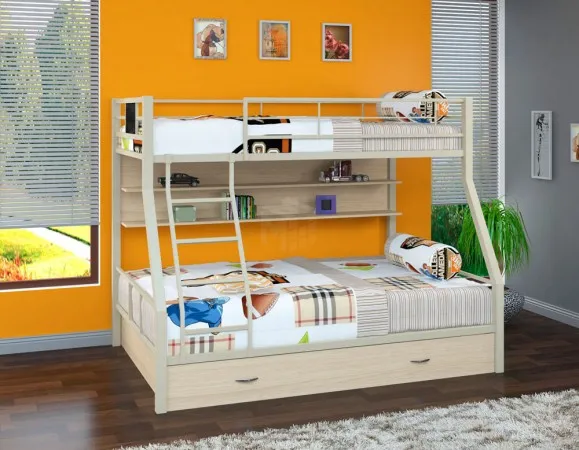 Полки отлично подойдут для размещения книг и сувениров, а выдвижной ящик, находящийся под нижним спальным местом, можно использовать для хранения постельных принадлежностей.