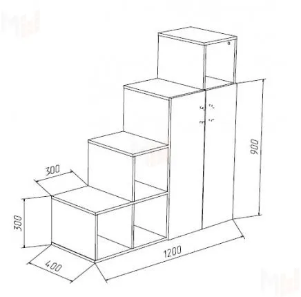 Конструкция лестницы состоит из открытых сквозных секций и закрытого шкафа с полками. Фасадная часть только с одной стороны.