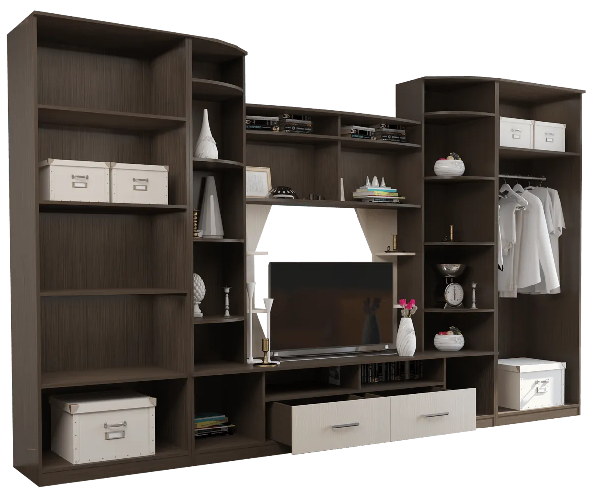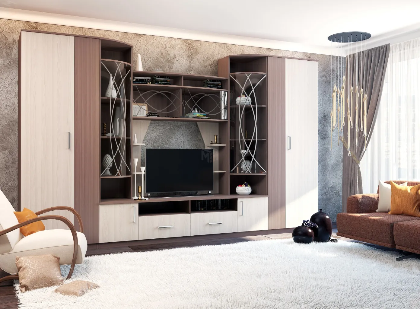 Гостиная Атланта украсит Вашу комнату своими необычными формами. Гнутые витрины добавят эстетичности и элегантности. Дополняют общую композиции два шкафы, один для одежды а другой с полками для хранения. Выполняется из высококачественной ламинированной ДСП.