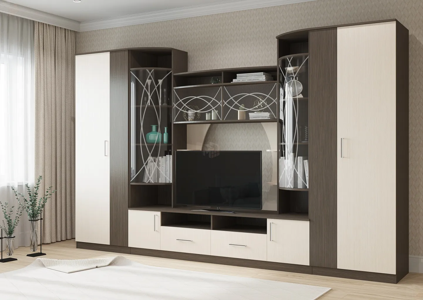 Гостиная Атланта украсит Вашу комнату своими необычными формами. Гнутые витрины добавят эстетичности и элегантности. Дополняют общую композиции два шкафы, один для одежды а другой с полками для хранения. Выполняется из высококачественной ламинированной ДСП.