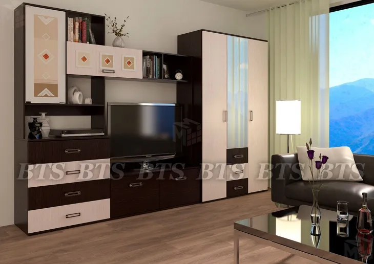 Если вам нужна не просто вместительная, но и оригинальная модульная система, то обратите внимание на гостиную Белла. Она подойдёт, как для помещения с малой площадью, так и для большой комнаты.