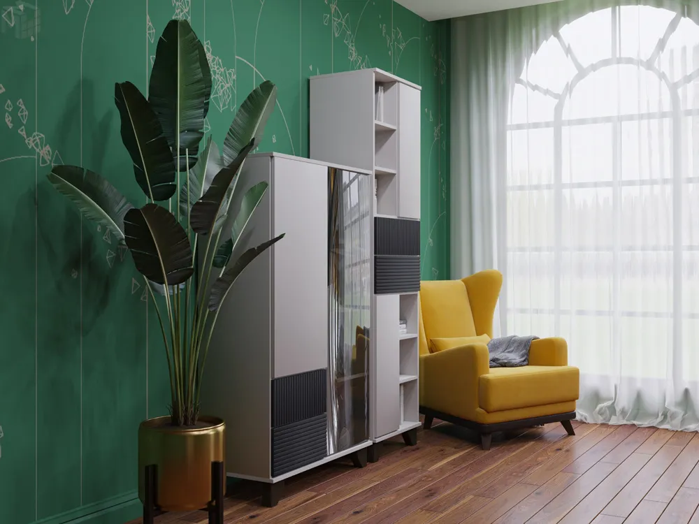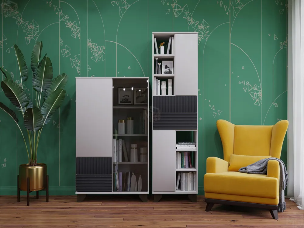 Применение композиционных принципов при обустройстве помещений позволяет гармонично расположить мебель и сохранить дизайнерское решение. Стеллаж со стеклом и пенал серии мебели в скандинавском стиле дают возможность разместить как предметы декора, любимые книги и фото, так и личные вещи.