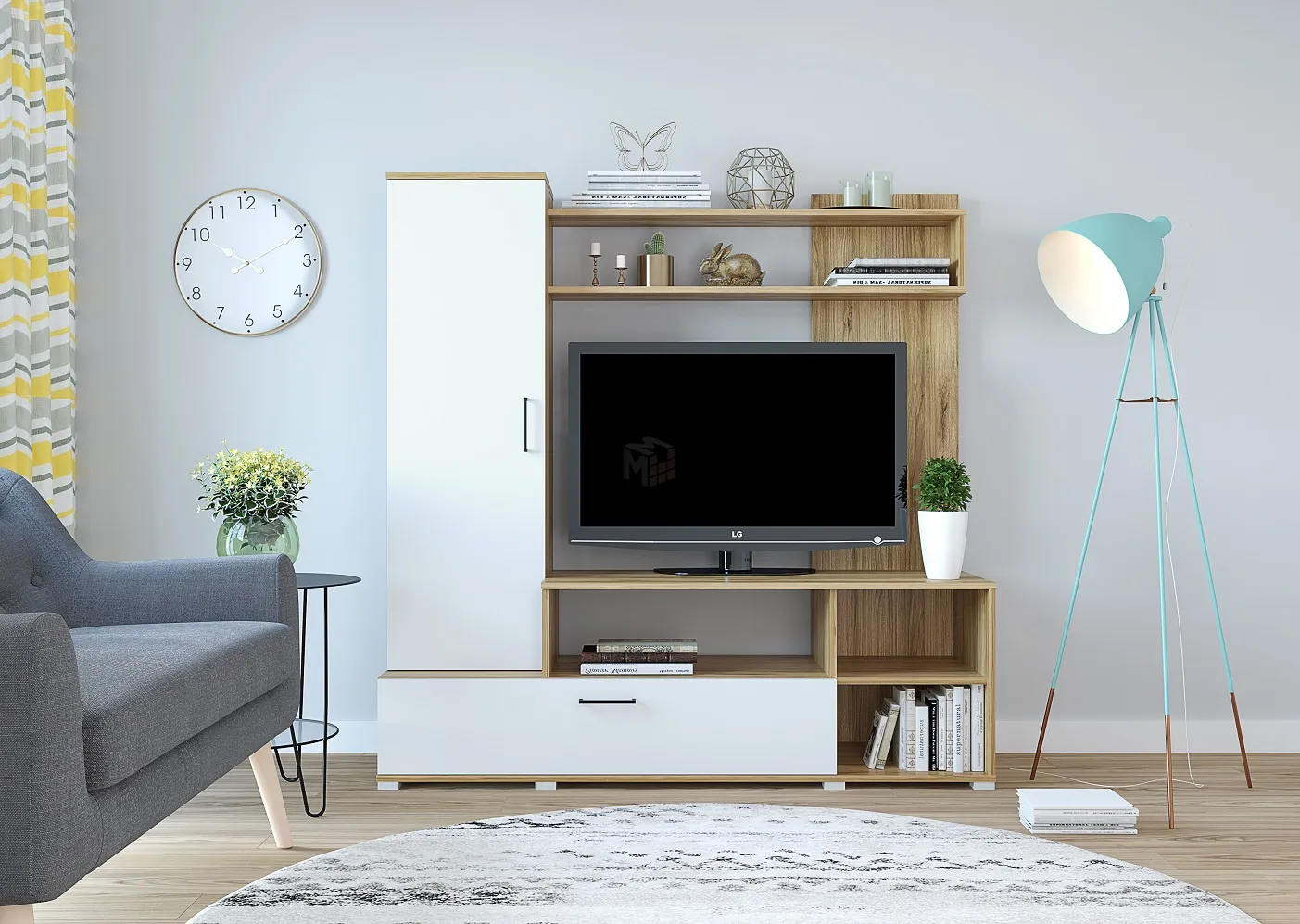 В этой маленькой стенке можно разместить небольшое количество самых необходимых вещей. Благодаря компактным размерам эта стенка впишется даже в очень маленькую комнату. Модель выполнена из ЛДСП в двух цветах: корпус дуб золотой, фасад белый.