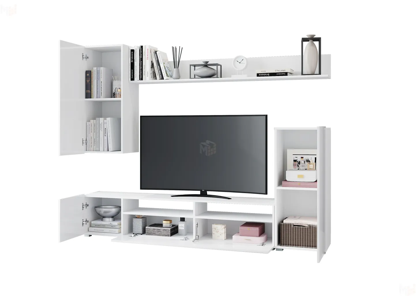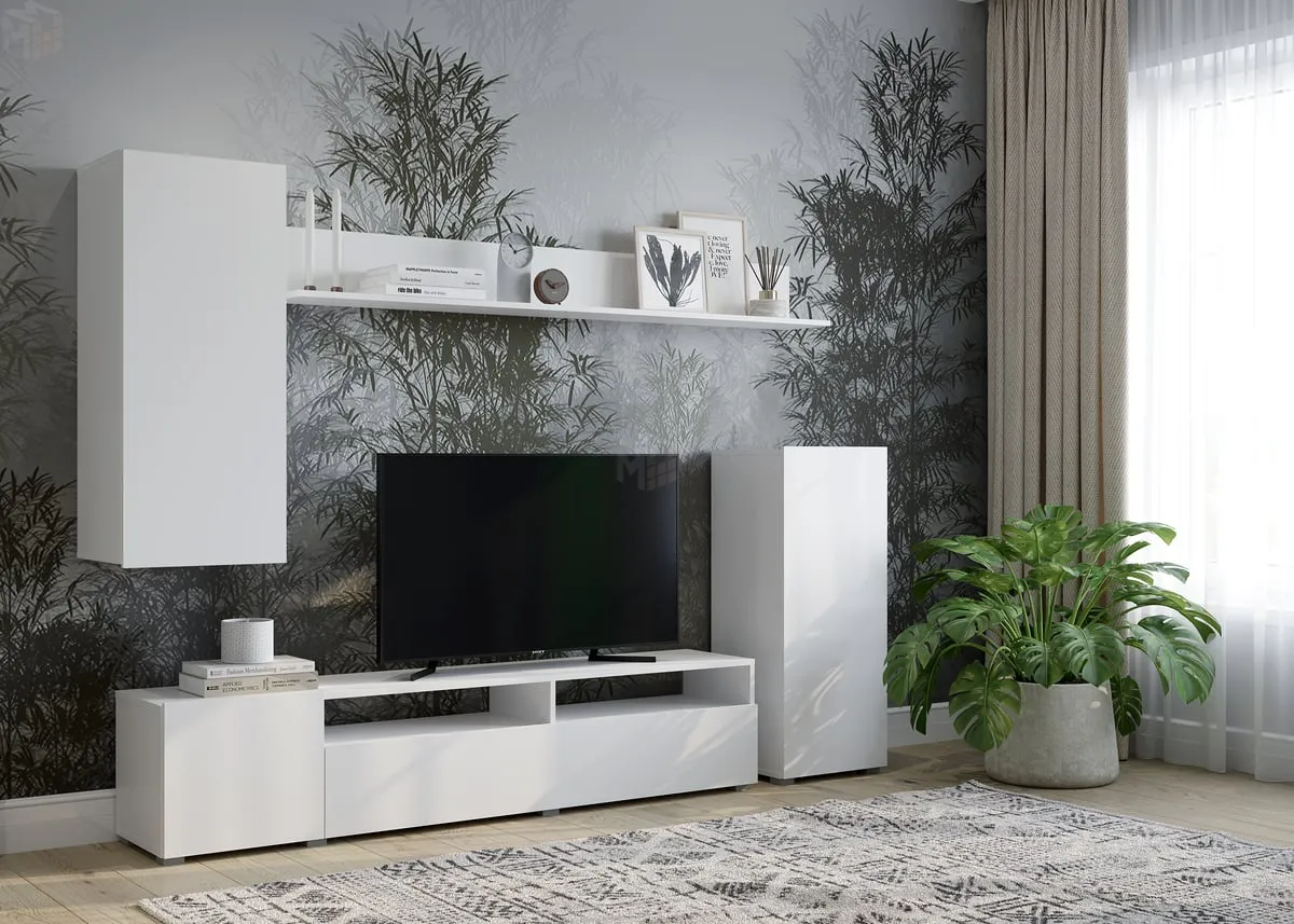 Корпус и фасады гостиной выполнены из ЛДСП белого цвета 16 мм.