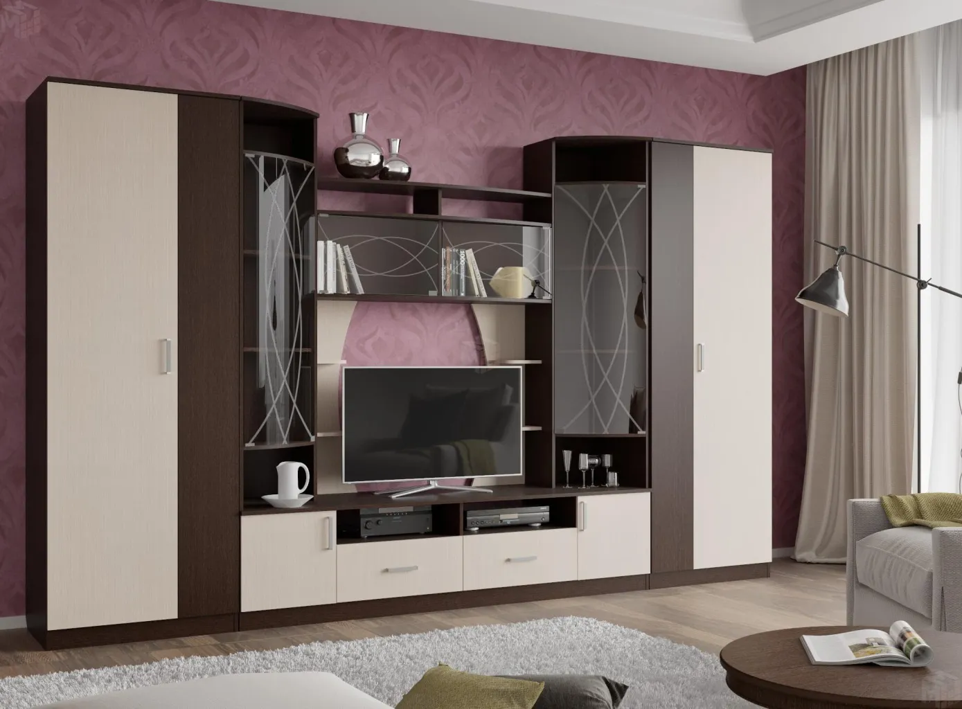 Гостиная "Лороза" сочетает в себе не только оригинальный дизайн, но и функциональность, она станет поистине украшением Вашей гостиной. Особый шарм этой модели придают стеклянные витрины, выполненные из тонированного стекла с пескоструйным рисунком.