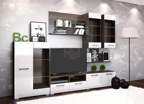 Корпус гостиной выполнен из ЛДСП, фасады МДФ глянец.