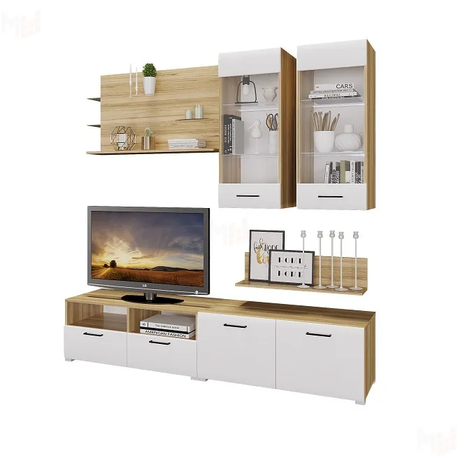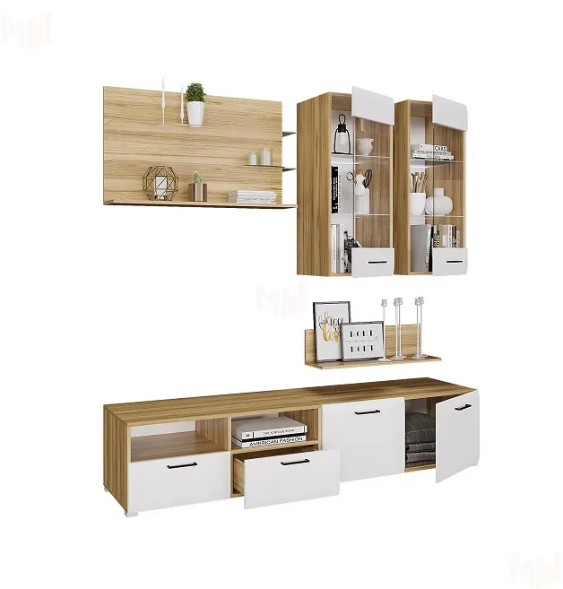 Современная горка для гостиной Ненси-3 может быть дополнена комодом, пеналом, шкафом для одежды или комодом. Набор состоит из ТВ тумбы, навесных витрин, навесных полочек.