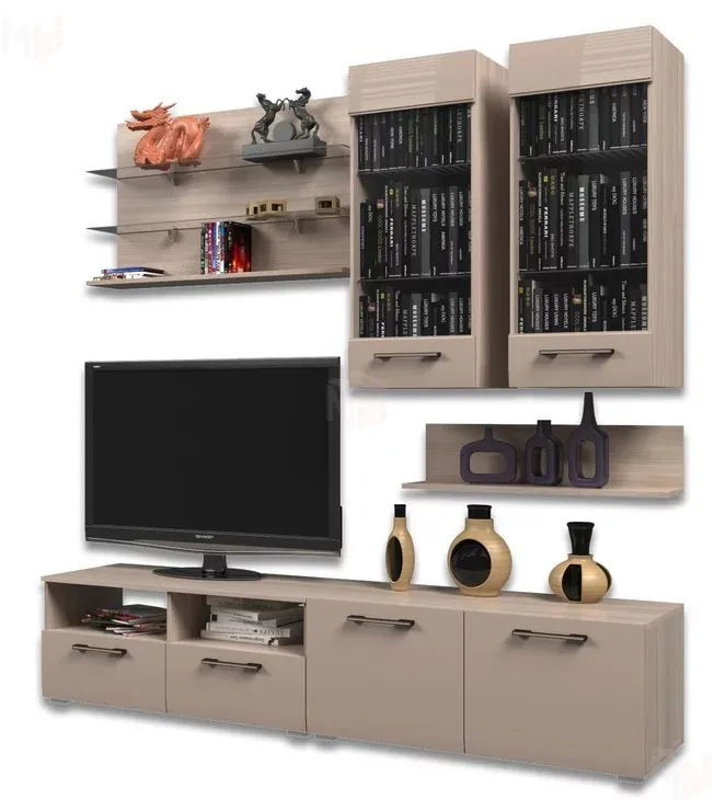 Современная горка для гостиной Ненси-3 может быть дополнена комодом, пеналом, шкафом для одежды или комодом. Набор состоит из ТВ тумбы, навесных витрин, навесных полочек.