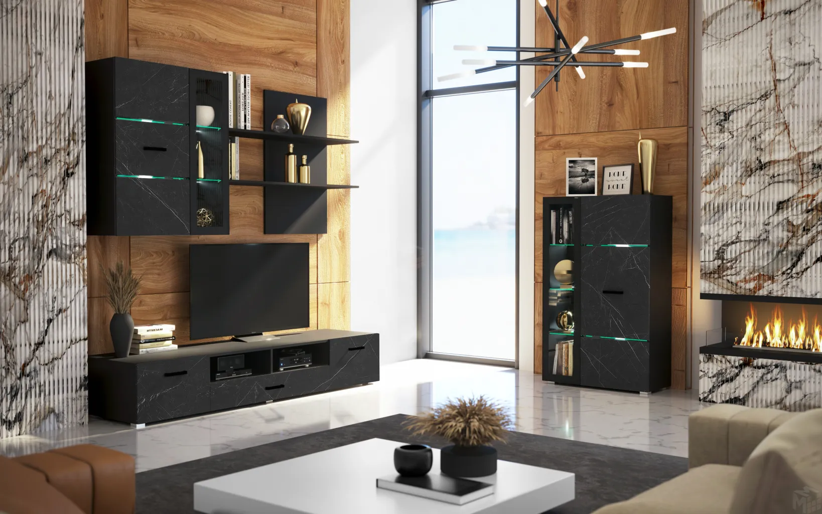 Корпус выполнен из ЛДСП Черный, фасады МДФ Мрамор блэк софт. -