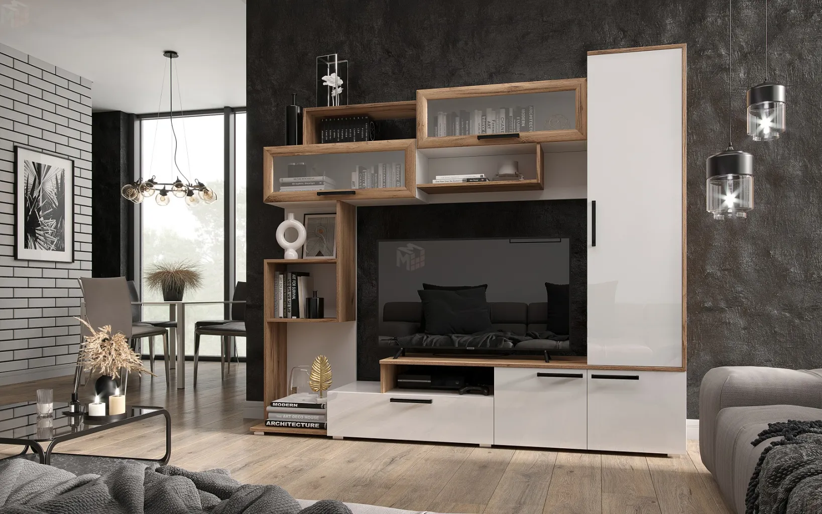 Эффектная гостиная в контрастном цветовом исполнении. Открытые секции гармонично сочетаются с закрытыми. Верхняя часть каскадная, что характерно для современной мебели.