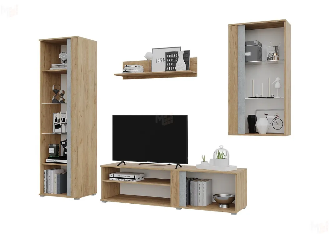 Корпус гостиной выполнен из ЛДСП Крафт золотой, фасады ЛДСП Крафт золотой/Бетон. -