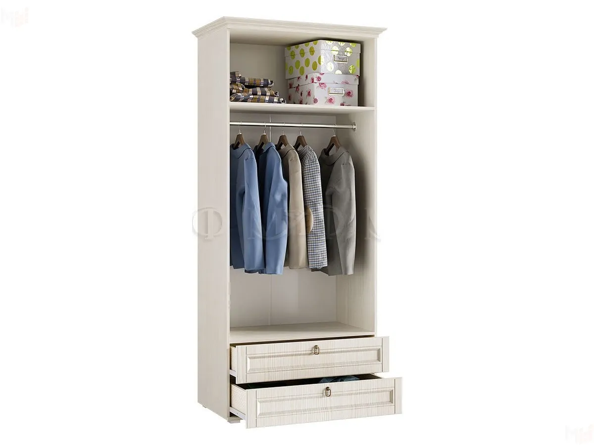 Шкаф платяной (ширина 900 мм без карниза/975 мм с карнизом, глубина 528/577 мм с карнизом, высота 2185 мм). Наполнение шкафа - верхняя полка, штанга для одежды, снизу выдвижные ящики для белья.