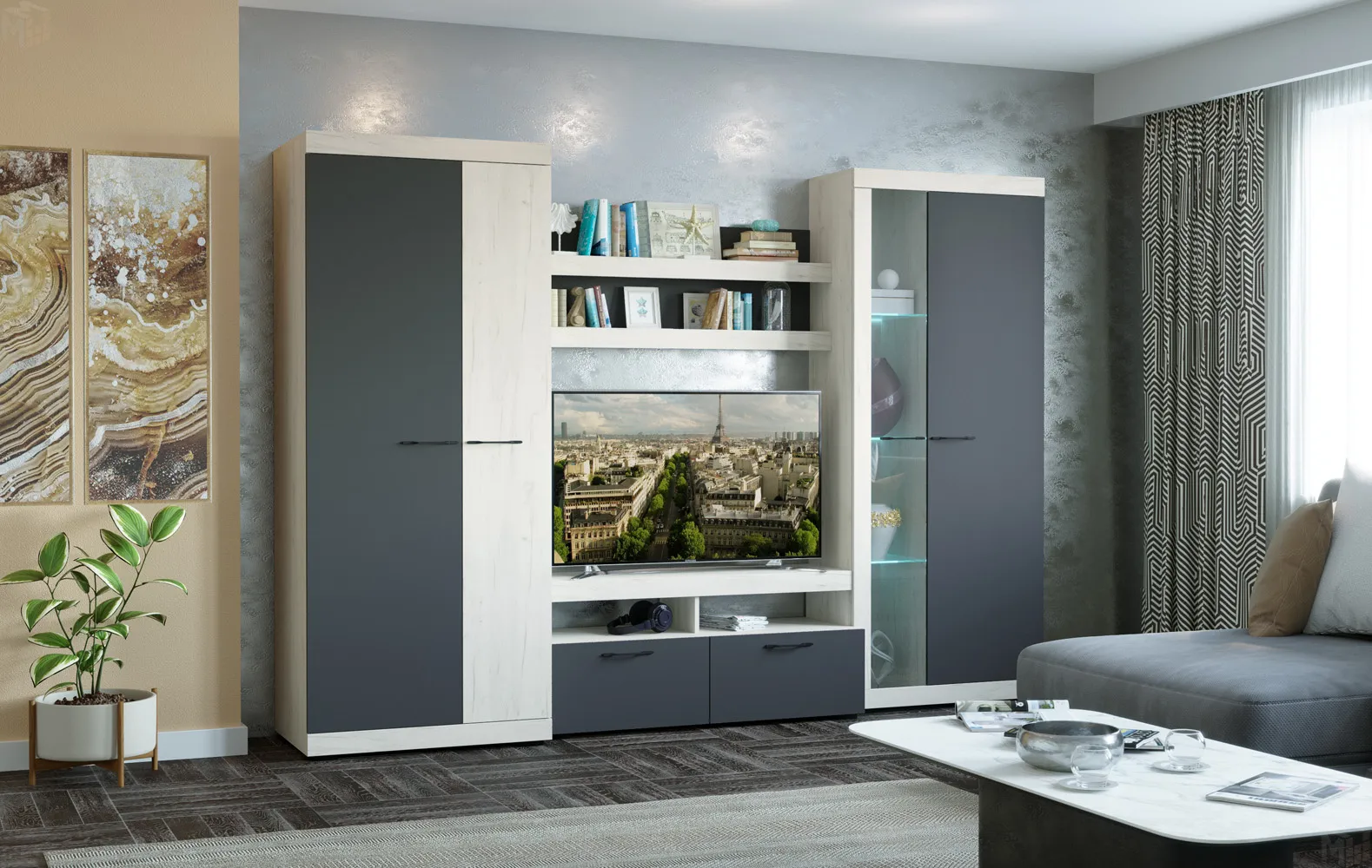 Цена комплекта Дуб Крафт белый - Антрацит; Дуб Сонома - Белый глянец зависит от стоимости модулей