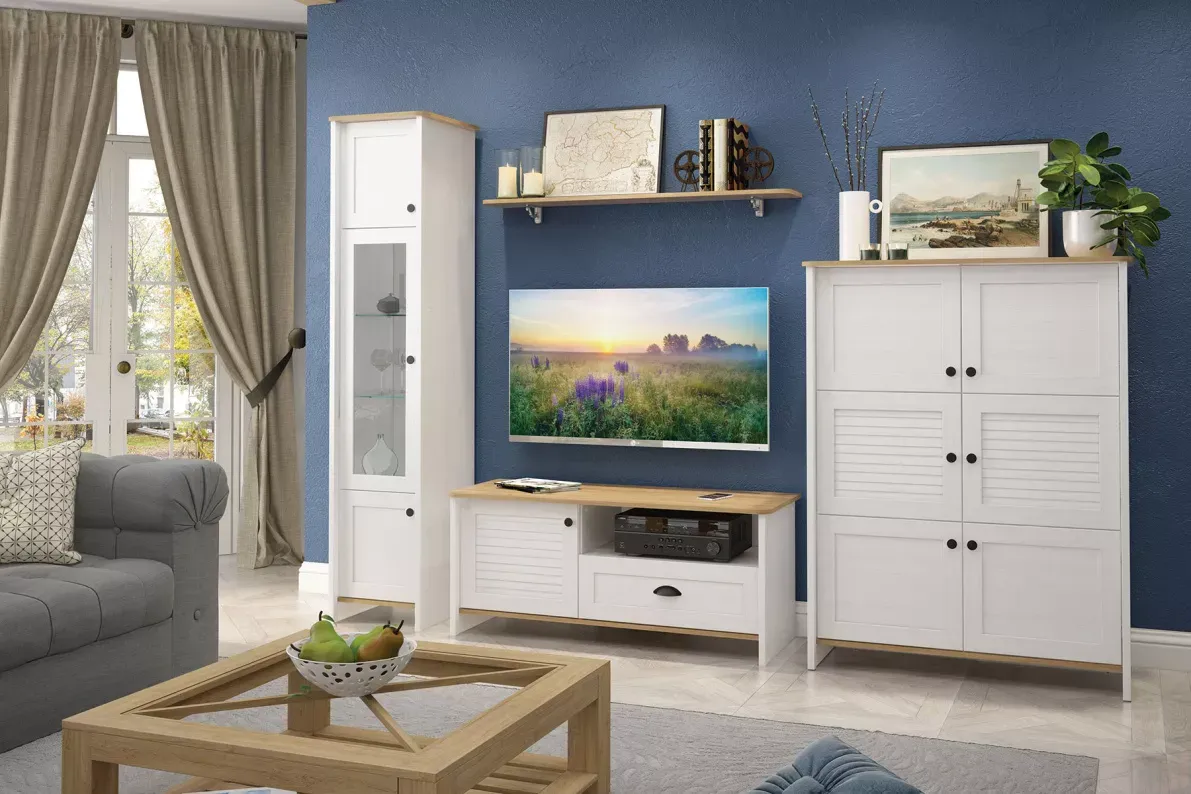 Корпус модульной системы изготовлен из 16 мм ламинированой древесностружечной плиты «Дуб Небраска» и 16 мм древесностружечной плиты, укрытой финиш-ппленкой «Сосна Белая». Торцевые поверхности корпуса закромлены кромками ABS и ПВХ. Рамочные фасады изготовлены из МДФ профиля и укутаны финиш-пленкой «Сосна Белая».