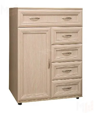 Комод выполнен из ЛДСП, имеет несколько маленьких и больших выдвижных ящиков, а также закрытую дверцей секцию, внутри которой находятся полки. Фасады декорированы МДФ рамками.